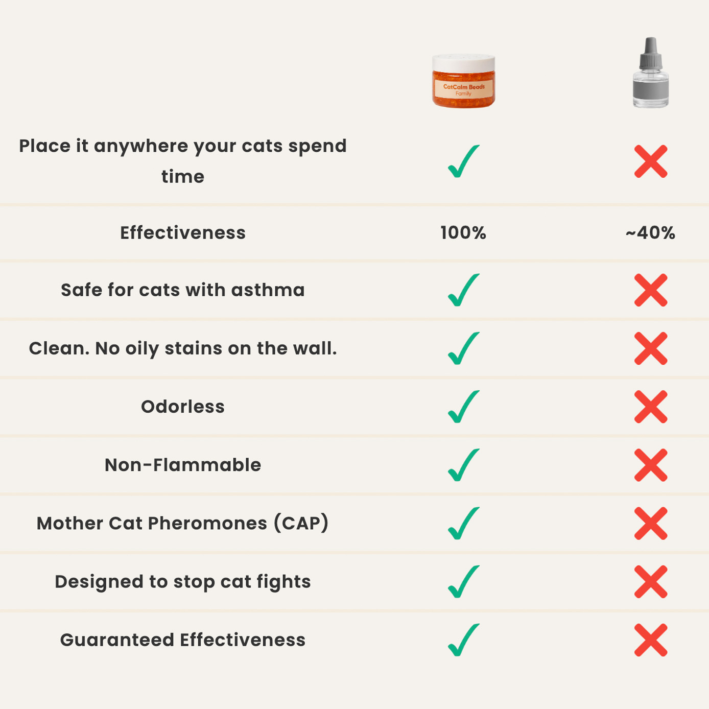 Unlike diffusers, CatCalm Family uses gel bead technology to release the pheromones at room temperature, without any heat that would destroy the pheromone molecules before they even reach your cats. Place it freely around your home at your cats' favorite spots.